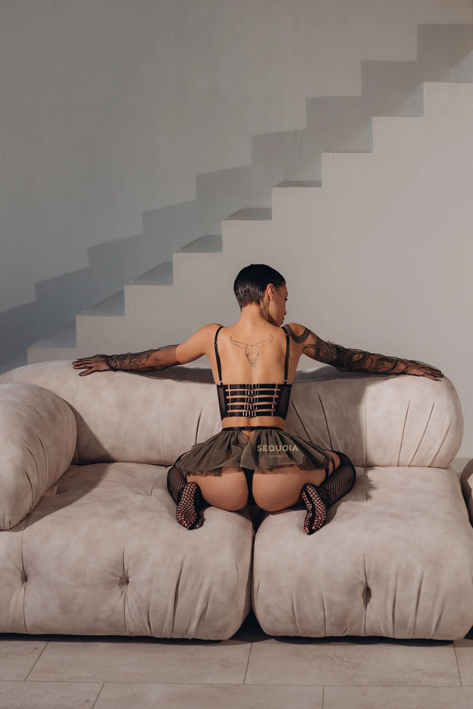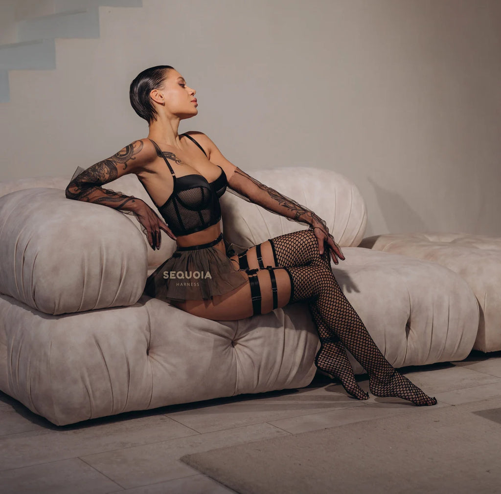 If you are looking for lingerie not for sleep, but for more spicy and intimate things - we have found the perfect set for you. Our bra corset fits perfectly on any figure and it does not matter what size you are. Lingerie can be adjusted and customized to your parameters. To emphasize your elegance and lightness, we made transparent gloves and a mini skirt.