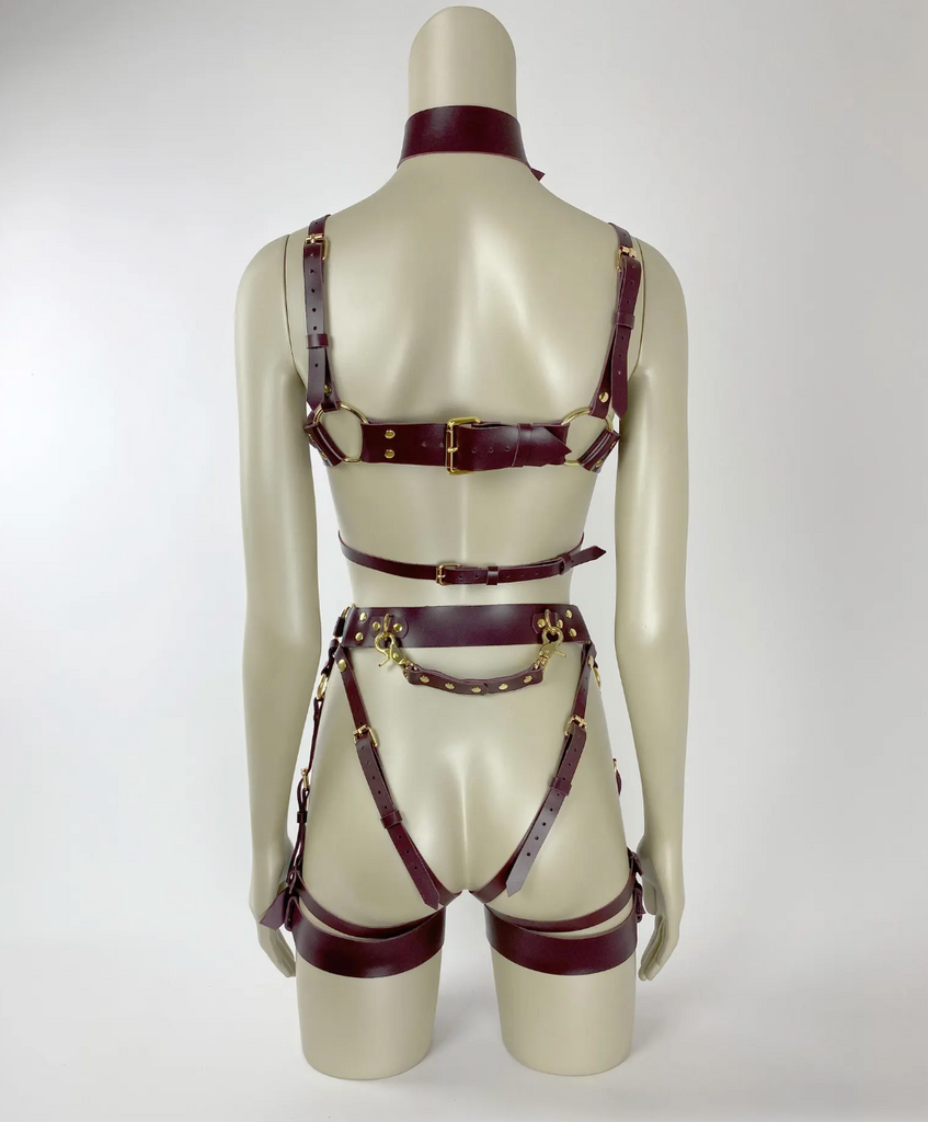 Leather Harness Set "Sub" Marsala & Choker & Handcuffs