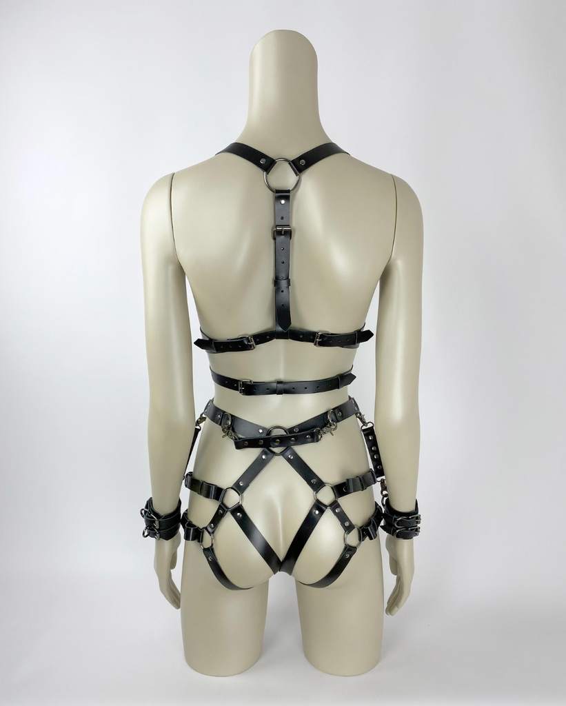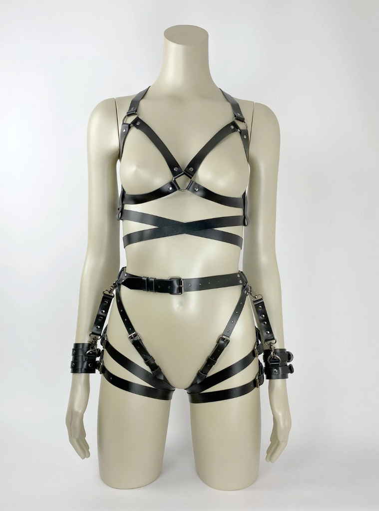 Elevate your look with this handcrafted leather body harness set, designed to accentuate your silhouette with bold, fashion-forward styling. The versatile design allows the cuffs to be attached to any ring on the full-body harness or detached for freedom of movement, offering multiple styling options. Perfect for costumes, photoshoots, festival outfits, or fashion styling, each piece is adjustable for comfort and a custom fit, handcrafted to ensure durability and quality.